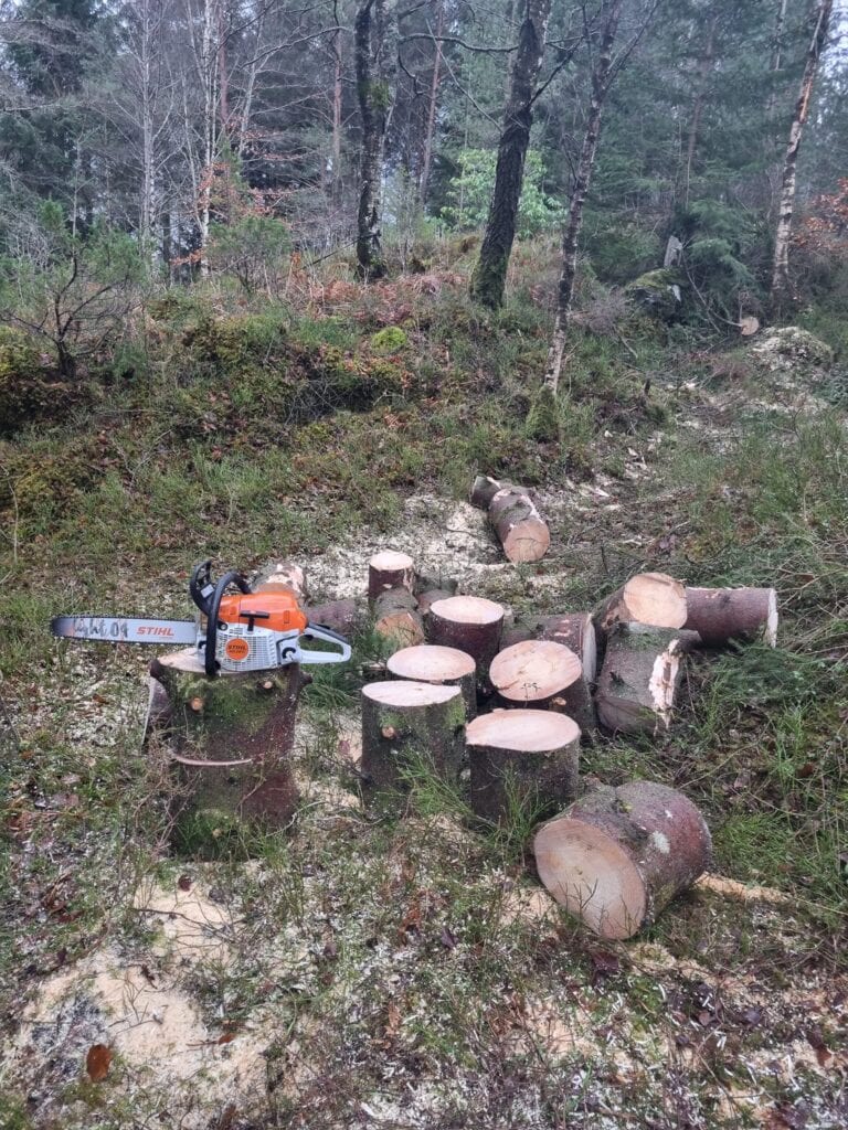 Vi har lang erfaring og høy kompetanse innen sikker trefelling og følger alltid gjeldende HMS-rutiner. Etter fellingen kan vi også hjelpe med bortkjøring av kvist og stamme, eller kutting av veden om ønskelig.